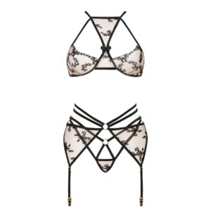 Discover Aisha’s stunning black lingerie set, which includes a bra, thong and garter belt.This exceptional set, made from nude tulle and adorned with a black floral pattern, will accentuate your natural beauty and make you feel sensual and luxurious. Perfect for special moments and as an unforgettable gift for a loved one.Main features:Design: The black Aisha set is the perfect example of elegance and understated charm. The combination of delicate tulle with embedded black patterns creates a harmonious outfit that gently hugs the body. The outfit adapts perfectly to the silhouette, emphasising your features in a sophisticated way. The adjustable straps and fastenings ensure a perfect, comfortable fit, allowing you to wear it all day and into the evening.Luxurious tulle: A subtle, transparent material that adds exceptional charm.Black floral pattern: Elegant and delicate embellishments that add sensuality.Transparent materials: Comfortable and sensual body coverage.Adjustable straps and fasteners: Perfect fit for any silhouette.Elegantly decorated bra and thong: Accentuate the body’s natural beauty.Packaging: Presented in an elegant box with a photo of the product.Sizes: S/M and L/XL.S/M: (Breasts: 81-91 cm, B-C, Waist: 56-71 cm, Hips: 85-97 cm).L/XL: (Breasts: 91-107 cm, C-D, Waist: 71-91 cm, Hip: 97-112 cm).Material: 70% polyamide, 30% polyester.