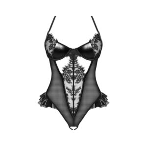 This stunning body from the Rafaella series is crafted from a combination of lace tulle and wetlook material which accentuates the figure while adding elegance and sensuality. The cups are adorned with delicate lace subtly highlighting the bust in a seductive yet refined way. The open front decorated with tulle and lace inserts adds sophistication. The back features playful ruffles adding a feminine touch to complete the look. This body is the perfect blend of elegance and sensuality making it an ideal choice for romantic evenings and special occasions.Material: Delicate tulle and wetlook inserts beautifully highlight the curves.Cups: Adorned with lace subtly enhancing the bust.Design: Open front with lace details and cutout.Back: Decorated with playful ruffles adding a light feminine touch.Adjustable straps: Ensuring a perfect fit.Closure: Hook-and-eye closure at the back for comfortable wear.Use: Perfect for special occasions or sensual evenings.Gift-ready: Body comes in an elegant box featuring the product image.The lace and subtle details will make you feel beautiful and sensual.Gentlemen gift something that will enchant your loved one.Size: S/M and L/XL Size S/M: (Breasts: 81-91 cm B-C Waist: 56-71 cm Hip: 85-97 cm) Size L/XL: (Breasts: 91-107 cm C-D Waist: 71-91 cm Hip: 97-112 cm)Material: 88% polyester 12% elastan