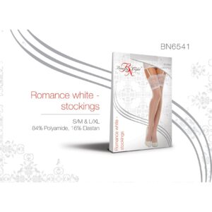 Romance white stockings are the perfect choice for any woman who wants to add elegance and sensuality to her look.These delicate white stockings are an excellent complement to any lingerie outfit. Made from the highest quality materials, they guarantee not only an elegant look, but also all-day comfort.Main features:Colour: classic white, perfect for any occasionLace trim: the subtle, floral lace adds a touch of romanceHigh quality material: soft and elastic, providing comfortGarter belt compatible: goes perfectly with a garter beltPackaging: Elegant box with the product presentation photo, marked with the Beauty Night Fashion logo hologram.Sizes: S/M or L/XL.S/M (height: 140-165 cm, hips: 88-102 cm).L/XL (height: 150-178 cm, hips: 100-120 cm).Material: 84% Polyamide, 16% Elastane.