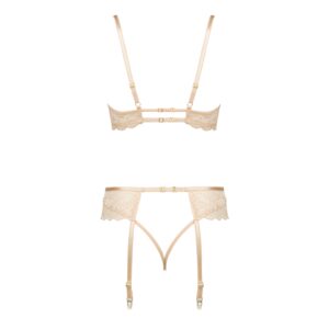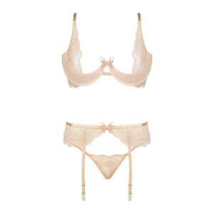 Introducing the exquisite Rose Set Nude lingerie set, which includes a bra, thong, and garter belt. This subtle and elegant ensemble, crafted from delicate lace in a nude shade, enhances your natural beauty and boosts your confidence in every situation. Perfect for romantic evenings or as a gift for a loved one.Rose Set Nude embodies class and sophistication. The delicate lace adorning the bra and thong harmonizes perfectly with the transparent, lightweight fabrics that gently caress the body. The set fits beautifully to the figure, highlighting its assets in the most refined way. Adjustable straps and closures ensure a perfect fit and comfort for all-day and night wear.Main Features:Luxurious lace: Delicate and intricate, giving the set an elegant appearance.Neutral nude shade: Perfectly enhances natural beauty, adding confidence.Transparent materials: Gently caress the body, providing comfort and sensuality.Adjustable straps and closures: Ensure a perfect fit to the figure.Beautifully adorned bra and thong: Elegantly showcase the figure’s assets.Comfortable wear: Designed for all-day and night wear, thanks to its perfect fit.Elegance and sophistication: A set that adds confidence and makes every moment special.Ideal gift: The entire set comes in an elegant package, perfect for a gift.Looking for the perfect gift for your partner? The Rose Set Nude is a hit. The neutral shade and subtle finishes make this lingerie not only elegant but also incredibly sensual. It’s the perfect way to express your feelings and appreciate the beauty of your loved one. With this set, every woman will feel special and appreciated.Size: S/M and L/XL Size S/M: (Breasts: 81-91 cm, B-C, Waist: 56-71 cm, Hip: 85-97 cm) Size L/XL: (Breasts: 91-107 cm, C-D, Waist: 71-91 cm, Hip: 97-112 cm)Material: 90% polyamide, 7% polyester, 3% elastan