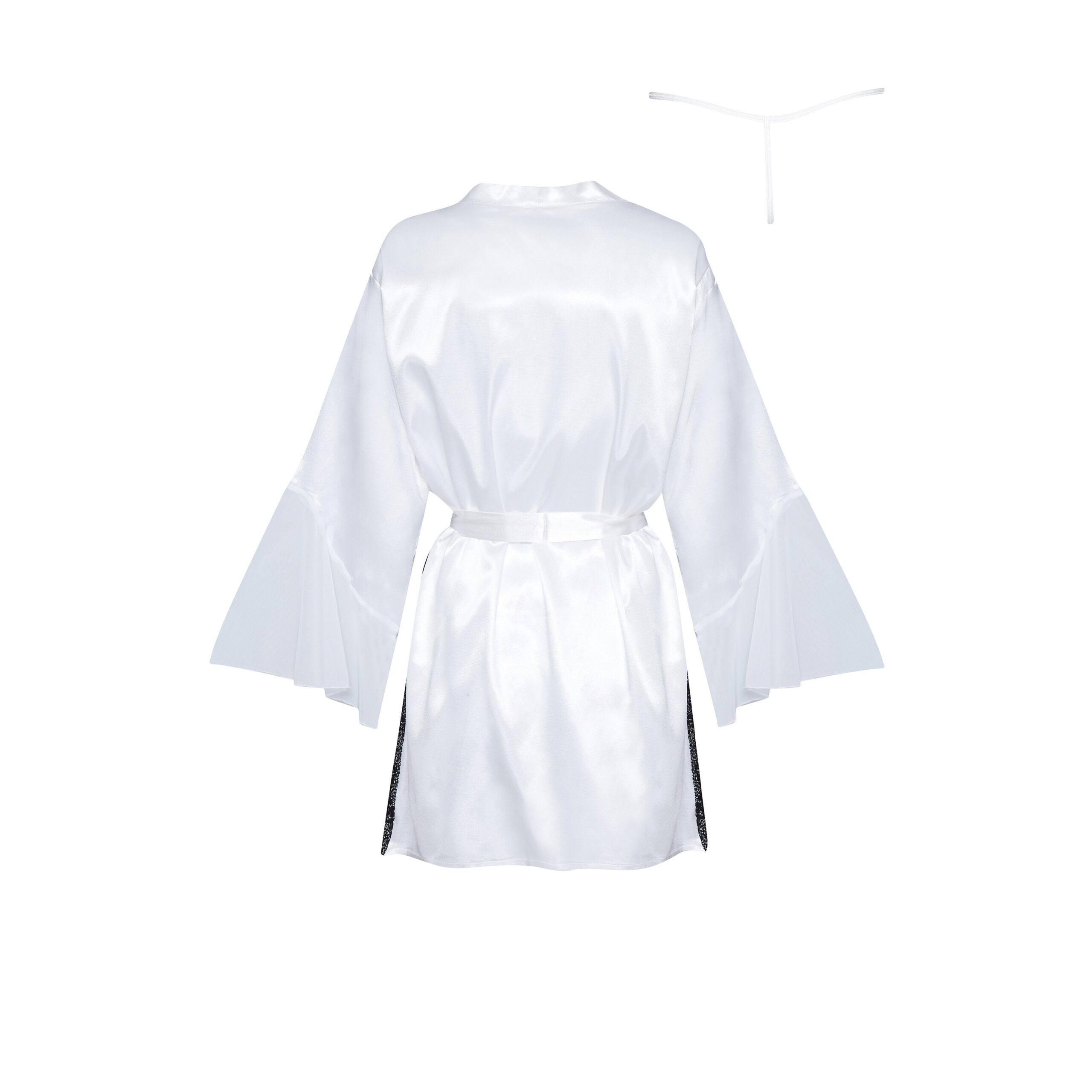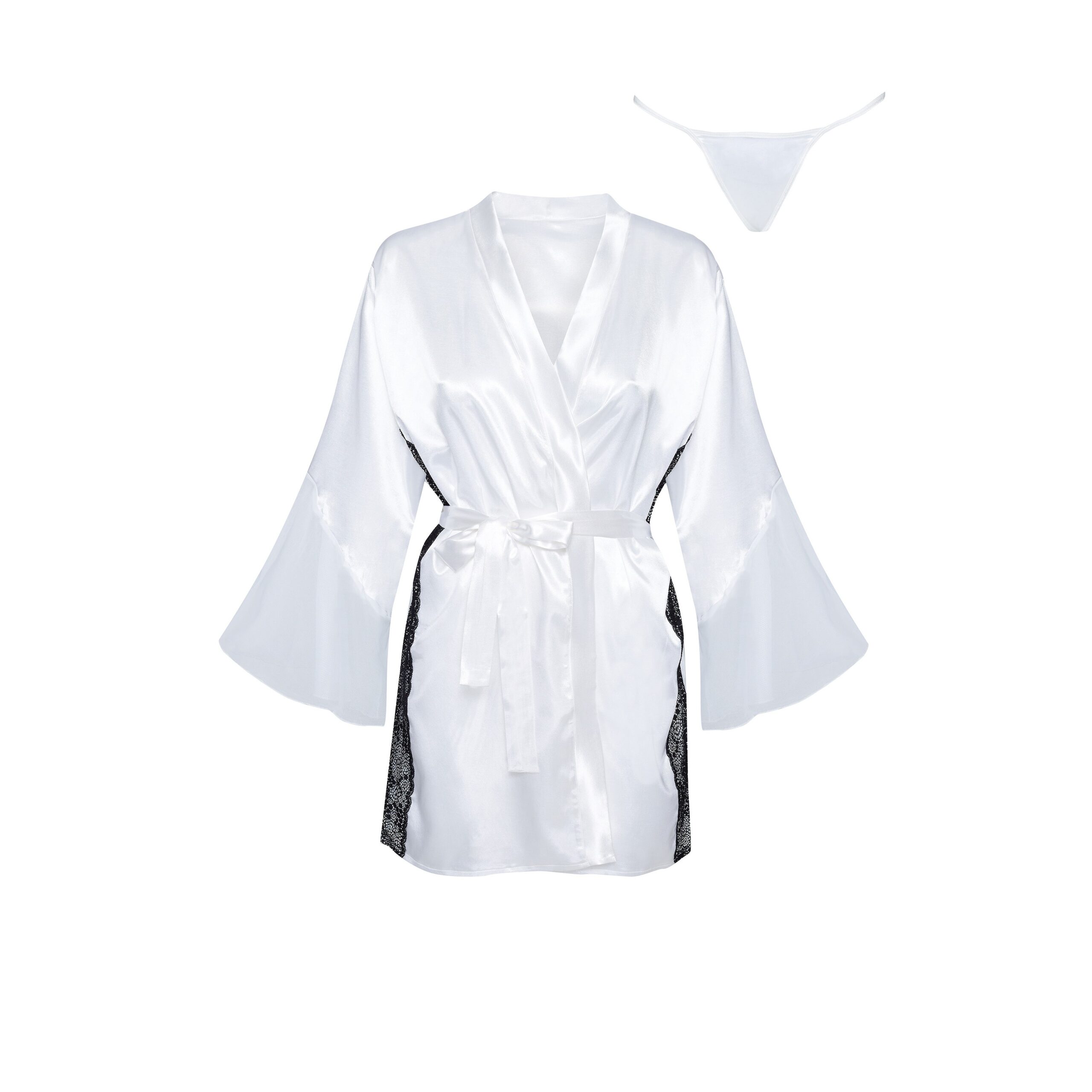 Experience true luxury and elegance with the Sara white peignoir, adding a touch of class to every moment spent at home.Main features:Luxurious material: Made from a delicate satin fabric that gently wraps around the body, ensuring maximum comfort.Sensual design: The white colour combined with black lace details and mesh inserts creates a unique and elegant look.Adjustable belt: The satin belt allows for a perfect fit, emphasising the waist.Versatile cut: Perfect for romantic evenings out and for everyday moments of relaxation at home.Set with knickers: Matching thong included to complete the look.Wide sleeves: The wide mesh sleeves add lightness and elegance.Perfect finishes: Every detail is crafted with the utmost care, guaranteeing durability and a unique look.Exclusive packaging: The set comes in elegant packaging with a photo of the product, making it perfect for a gift.Size: S-L (chest: 81-107 cm, hips: 80-115 cm)Material: 97% Polyester, 3% Elastane