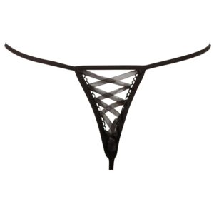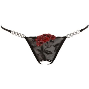 DESCRIPTION: Black thong with an enticing opening and embellished with a red rose with rhinestones. Possesses brilliant rings on the sides and a corset effect ribbon on the back of the thong. It’s presented in an elegant box and wrapped in silk paper.