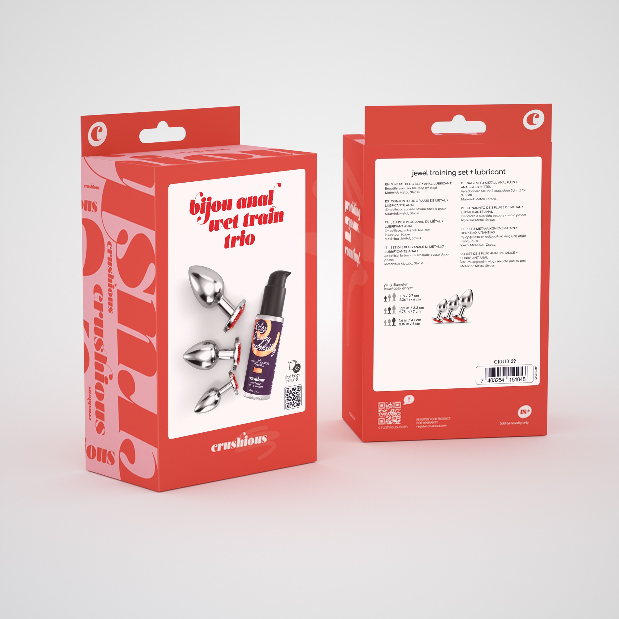 Indulge yourself in the most luxurious way! Crushious presents the most coveted and elegant anal jewellery collection. Bijou brings you sophisticated anal plugs, presented in a set of 3 different sizes to gradually increase their resistance.Bijou can be used as an adornment in a strip tease session and as extra stimulation during vaginal penetration.The metal is perfect for temperature play, submerge your plug in hot or cold water for new and exciting experiences!Use with lubricant for better insertion. Crushious lubes in Waterbased or Anal versions for even better results.The included 50 ml lubricant will help relax the muscles without numbing effect. The practical, lightweight and discreet packaging makes it perfect for carrying. Made in the E.U. and not tested on animals.Wash with warm water and mild soap after use, you can also use a toy-specific antibacterial detergent.Perfect for training anal endurance.Dimensions:S – Insertable Length: 6cm;Diameter: 2,7cm.M – Insertable length: 7cm;Diameter: 3,3cm.L – Insertable length: 8cm;Diameter: 4,1cm.