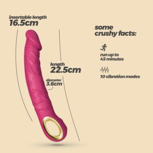 A powerful vibration available in 10 delicious modes is one of the assets from Magnus. Its realistic shape and 1 finger handle, promise to bring almost touch free pleasure.Long press the On/Off button to turn on. Use the vibration button to toggle between the amazing 10 modes.Long press the On/Off button to turn off.Being rechargeable via USB cable, assures powerful and steady modes from start till finish.Please completely charge before use. The light flickers when you connect the charger to signal that the battery is charging. When charge is complete, the light is steady. Full charge for 80 minutes.Use your vibrator for 50 minutes.Clean up is a snap, wash with warm water and neutral soap or use a toy cleaning spray. Use antibacterial cleaning spray for better results. Tap it dry and store away from light and heat sources.The use of lubricant is advised. Always use waterbased lubricants. Oils and other type of lubricants will damage the integrity of the material.Crushious lubricants are the best addition to your Crushious toys.Check the instruction manual prior to use.Dimensions: 22,5 cm in lenght; 16,5 cm insertable; 3,6 cm in diameterMaterial: Silicone, ABS.