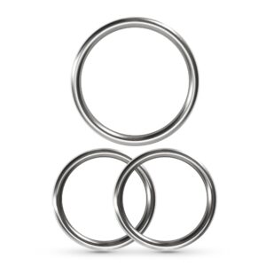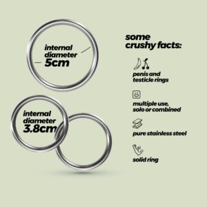 Do you look for a versatile and heavy-duty toy? Metaleros are the rings to rule them all!A 3 ring set that can be used to grip your shaft and the testicles.1 toy, a world of sensations.Want to increase your pleasure even more? Use the metal for temperature play, place the rings for some minutes in cold or hot water before use.Be careful not to use the rings for long periods of time.Cleaning is super easy, wash with warm water and mild soap or use a toy cleaning spray. Use antibacterial cleaning spray for best results. Dry and store away from light and heat sources.The use of lubricant is advised. Always use waterbased lubricants. Oils and other types of lubricants may damage the integrity of the material.Crushious lubricants are the best addition to your Crushious toys.Dimensions: Diameter: 3,8 cm; 5 cm.Material:Metal.