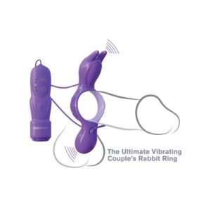 Powered by two super-strong vibrating micro bullets, the TPR ring is phthalate-free, body-safe, and fun for both of you. One end of the ring has soft bunny ears while the other is smooth and provides pinpoint clitoral stimulation. Choose between five powerful speeds to find an intensity that?s right for you. The super-strong vibrations will whisk you both away with every incredible movement. The comfortable ring easily stretches to put a clamp on performance letdowns, giving him the perfect squeeze to prolong the pleasure and delay ejaculation.