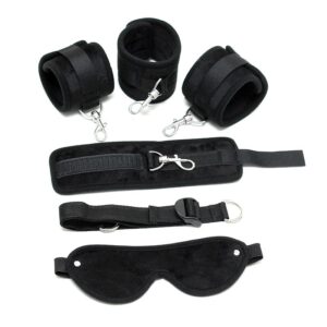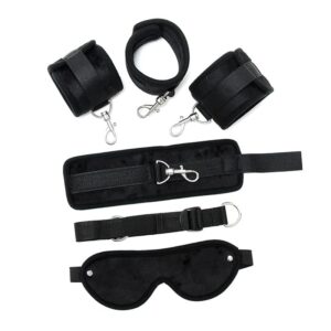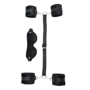 Let your imagination take you beyond your physical limits with this cuffs. Nice soft material restraint set with velcro fastening: mask, handcuffs, footcuffs, strap and 4 carabine hooks.