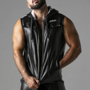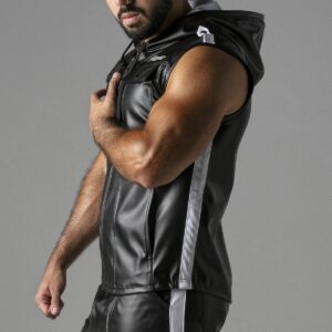 Sleeveless hoody, made from the finest leatherette stretch fabric.full front zip openingpinhole side bands in contrast colorprinted logo on chest
