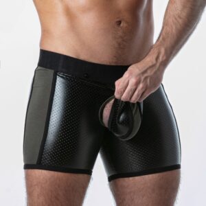 Square-cut boxer shorts in perforated synthetic leather with contrasting details.Removable frontGlory holeD-buckle inside the waistband for ‘RUB IT HARNESS’ fasteningFunctional zip on backsideCOMPOSITIONMain fabric: 86% Polyester – 14% ElastaneSecondary fabric: 95% cotton – 5% elastaneCAREMachine wash max. 30ºC / 86ºFDo not bleachDo not tumble dryDo not ironDo not dry clean
