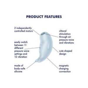 Ride the pressure waves with this charming marine creature: The Satisfyer Seal You Soon is the latest addition to the Satisfyer Double Air Pulse Vibrator range, featuring the beloved Satisfyer Air Pulse Technology as well as intense vibrations for unmatched clitoral stimulation. Place the opening around your clitoris and enjoy the sensation of touch-free pressure waves, choosing from one of the 11 air pulse programs. And there’s even more: to intensify this sensation, you can combine the air pulse feature with one of the 12 varied vibration programs. Of course, you can also use this vibrator as a classic lay-on vibrator, as both functions can be controlled independently. The surface of the Satisfyer Seal You Soon is made of soft, body-friendly silicone that gently glides over your body and your most sensitive areas, adding pleasure to the experience.