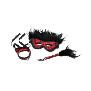 A sensual set of 3 pieces to surprise your partner. When with a small feathers to caress, a mask with feathers to add a touch of seduction and a collar for a more perverse touch.