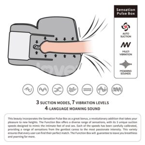 With the integration of realistic moaning sounds and 7 vibration frequencies, the Sensation Pulse Box goes even further to ensure a truly mind-blowing experience, evoking irresistible pleasure in every encounter, all while being gentle on your skin.