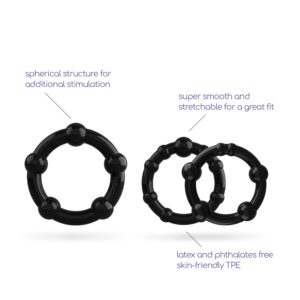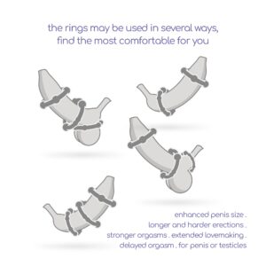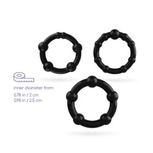 Intensify your erections and increase your stamina, these three rings can be used together or separately. Try different combinations and let the firm grip stimulate your senses.Main features:· 3 rings of different dimensions;· Stimulating bumps;· Great elasticity;· Perfect grip;· Perfect for the penis and testicles;· Delay ejaculation;· Use alone or with company;· Phthalate free;· Made of hypoallergenic TPE;· Waterproof.Use with water-based lubricant.Dimensions: 2 – 2,5cm, expandableIncludes leaflet with instructions inside.Caution: Prolonged and frequent use of devices that increase the size of the penis can cause rupture of blood vessels, hemorrhage and the formation of bruises. This device can also aggravate existing medical conditions, such as peyronie’s disease, priapism and urethral stricture. Penis enlargement devices should always be used with discretion.